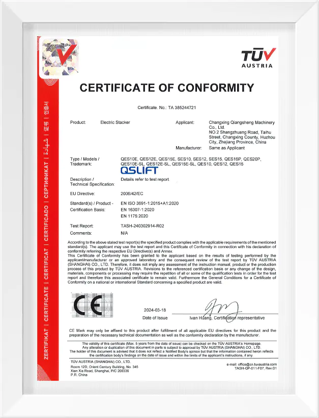 Lightweight yet robust, the QES10E/QES12E integrates durability, efficiency and space-saving design, with low maintenance and user-friendly operation—making it a professional and cost-effective electric stacker for optimizing small-space material handling and stacking operations.